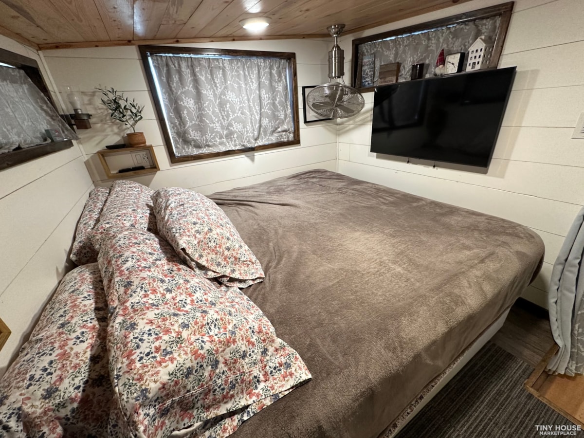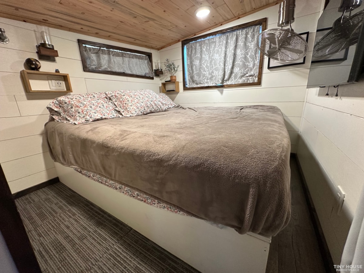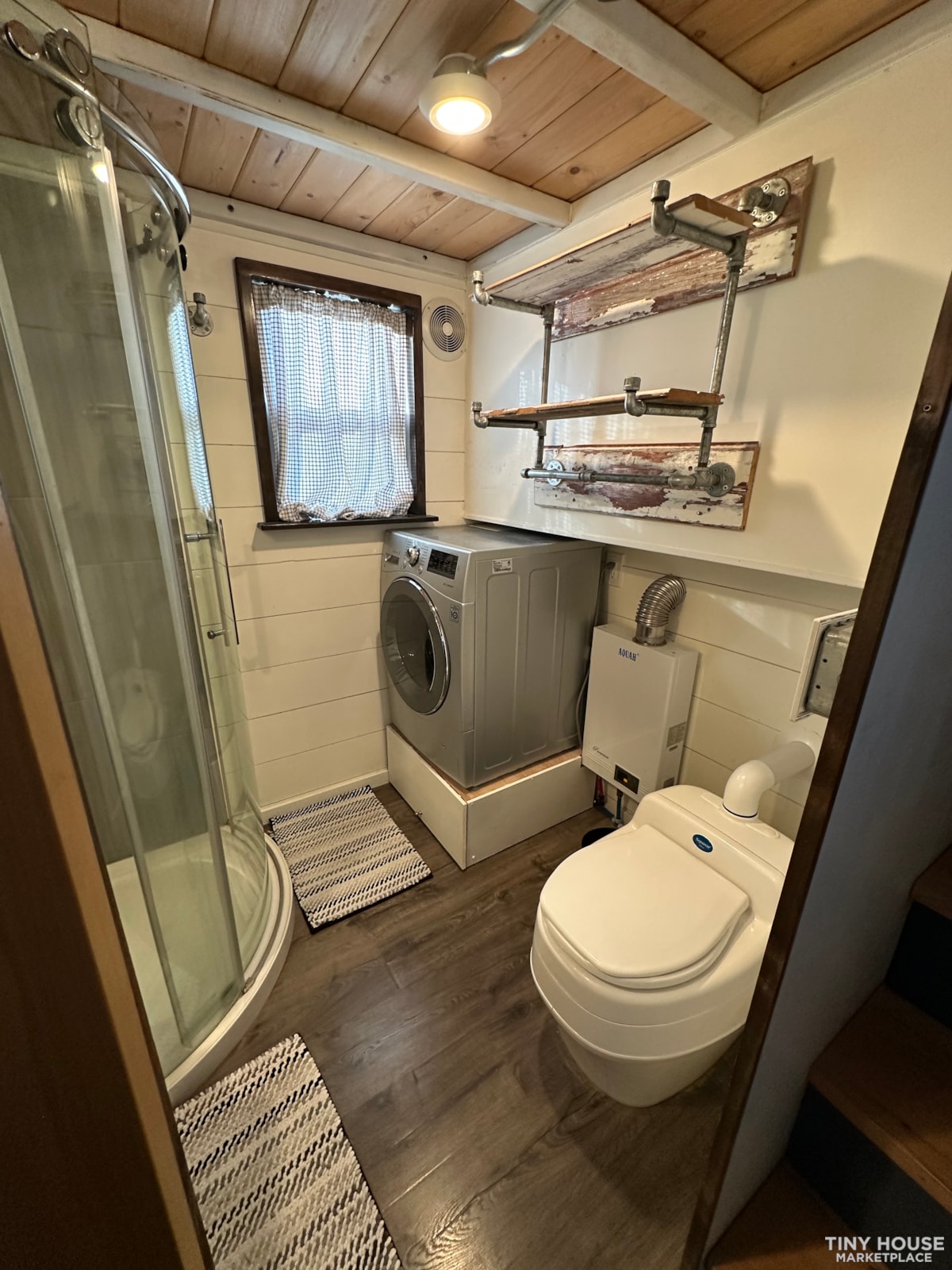 Beautiful 325 sq foot tiny home on trailer. Built I 2019 with some upgrades since! Goose neck with main bedroom in the gooseneck featuring king size bed with storage under, nice closet and second loft with queen mattress to could be used for storage. Includes washer/dryer combo and Separate composting toilet, is hooked up to sewer as of right now, but can be moved to off grid living.